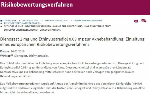 Das BfArM informiert über die Einleitung eines europäischen Risikobewertungsverfahrens zu Dienogest 2 mg und Ethinylestradiol 0.03 mg zur Behandlung von Akne.